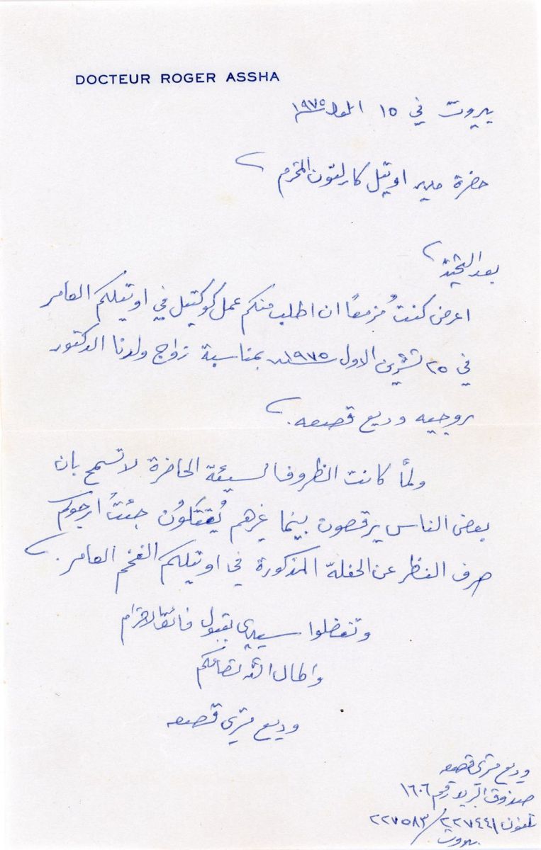 Among the documents of the Carlton Hotel archive that are preserved at UMAM Documentation & Research, there appears a letter dated 15 September 1975. The letter is addressed to the hotel’s manager. Its author, Dr. Wadi’ Qasaa, had planned to hold a cocktail reception at the hotel on 25 October 1975 to celebrate the marriage of his son, Dr. Roger. Yet the letter does not concern the organization of the reception, but rather its cancellation.